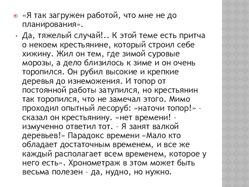 случай!.. К этой теме есть притча о некоем крестьянине, который строил себе хижину. Жил он тем, где зимой суровые морозы, а дело близилось к зиме и он очень торопился. Он рубил высокие и крепкие деревья до изнеможения. И топор от постоянной работы затупился, но крестьянин так торопился, что не замечал этого. Мимо проходил опытный лесоруб: «наточи топор!» – сказал он крестьянину. «нет времени! – измученно ответил тот. – Я занят валкой деревьев!» Парадокс времени «Мало кто обладает достаточным временем, и все же каждый располагает всем временем, которое у него есть». Хронометраж в этом может быть весьма полезен – да, нудно, но нужно.