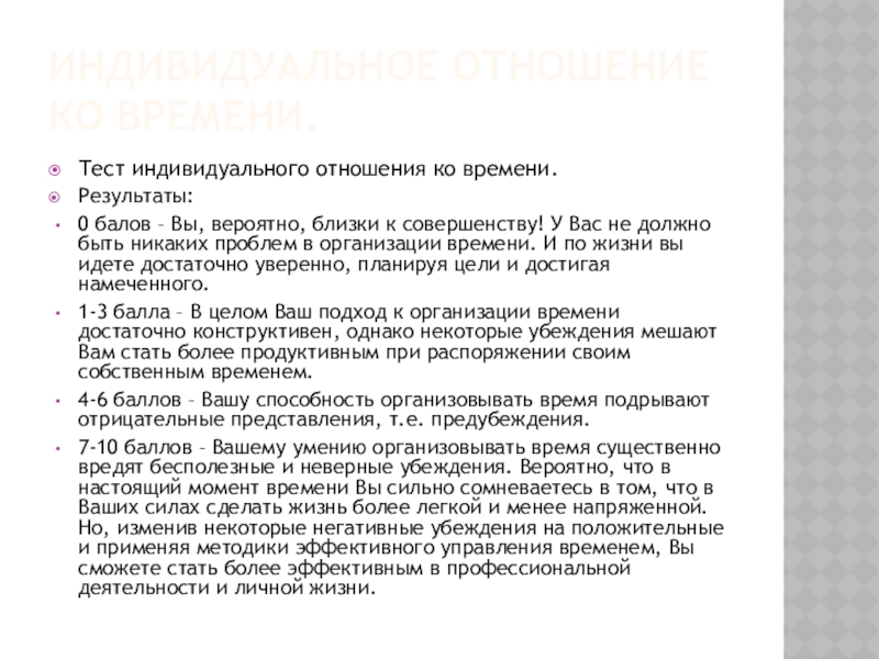 1-3 балла – В целом Ваш подход к организации времени достаточно конструктивен, однако некоторые убеждения мешают Вам стать более продуктивным при распоряжении своим собственным временем.
