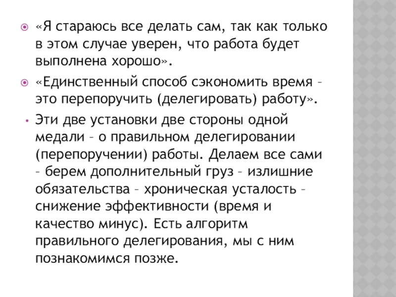 Эти две установки две стороны одной медали – о правильном делегировании (перепоручении) работы. Делаем все сами – берем дополнительный груз – излишние обязательства – хроническая усталость – снижение эффективности (время и качество минус). Есть алгоритм правильного делегирования, мы с ним познакомимся позже.