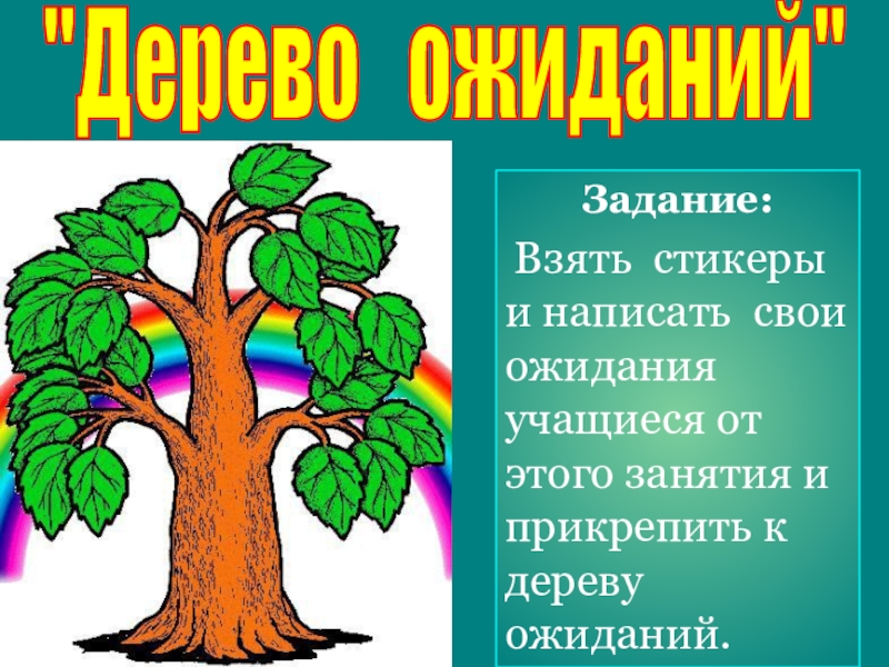 Взять стикеры и написать свои ожидания учащиеся от этого занятия и прикрепить к дереву ожиданий.