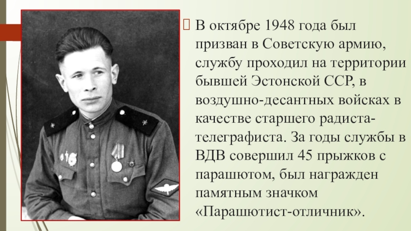 Слайд 13В октябре 1948 года был призван в Советскую армию, службу проходил