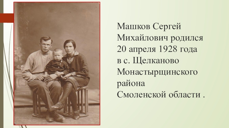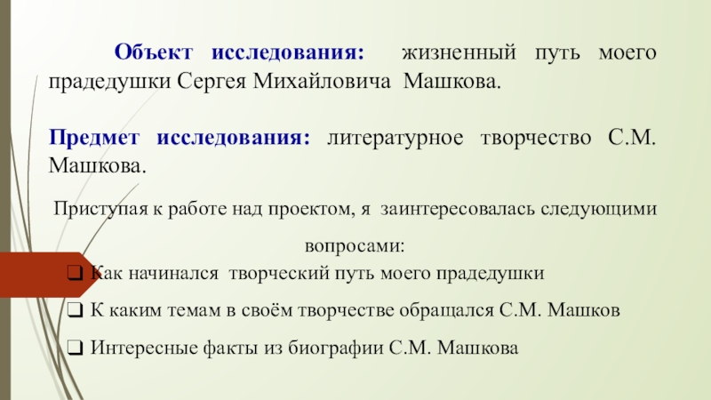 Слайд 3 Объект исследования: жизненный путь моего прадедушки Сергея Михайловича Машкова.