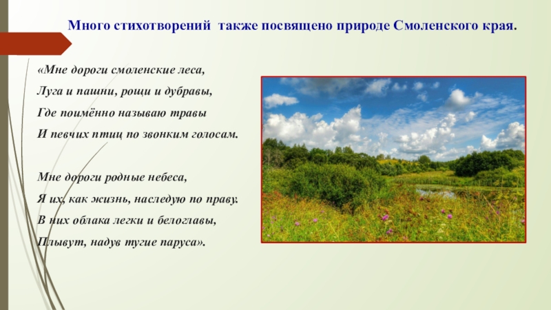 Слайд 20 Много стихотворений также посвящено природе Смоленского края.