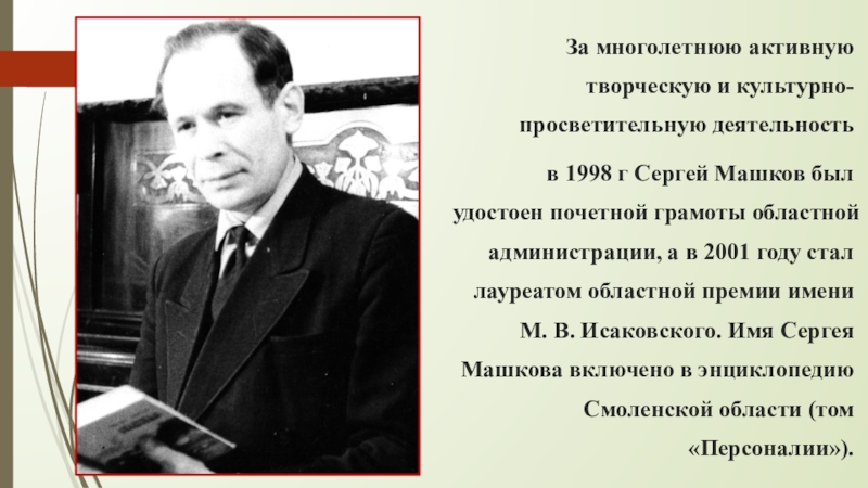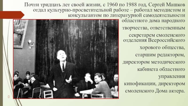 Сергей Машков отдал культурно-просветительной работе – работал методистом и консультантом по литературной самодеятельности областного дома народного
