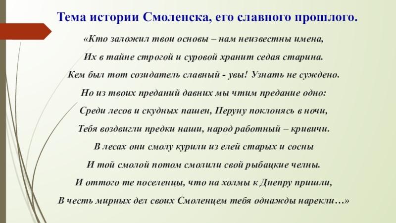 Слайд 19 Тема истории Смоленска, его славного прошлого.