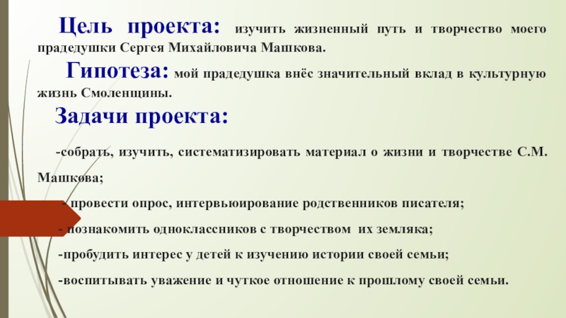 Слайд 4Цель проекта: изучить жизненный путь и творчество моего прадедушки Сергея Михайловича