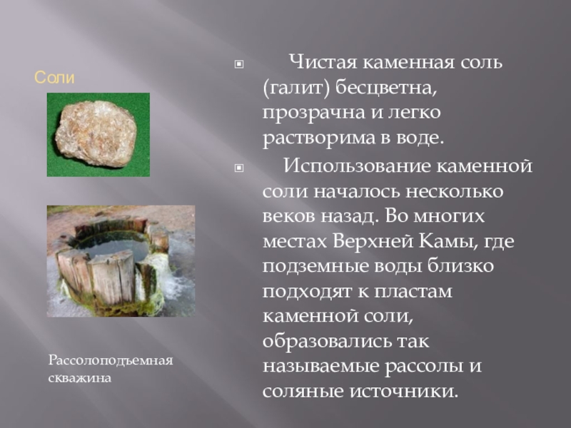 Использование каменной соли началось несколько веков назад. Во многих местах Верхней Камы, где подземные воды близко подходят к пластам каменной соли, образовались так называемые рассолы и соляные источники.