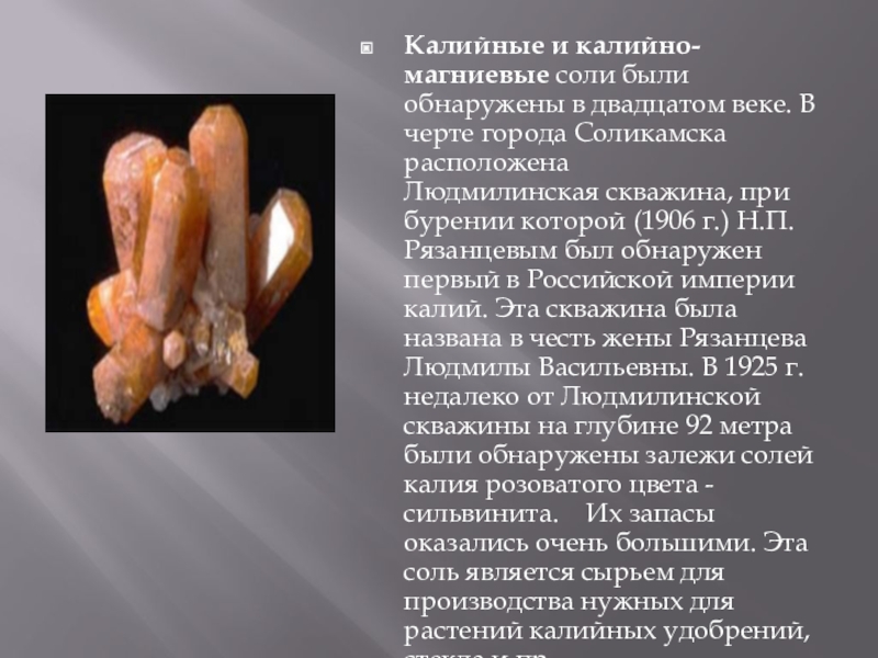 Слайд 6Калийные и калийно-магниевые соли были обнаружены в двадцатом веке. В черте города