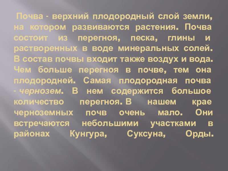 из перегноя, песка, глины и растворенных в воде минеральных солей. В состав почвы входит также воздух и вода. Чем больше перегноя в почве, тем она плодородней. Самая плодородная почва - чернозем. В нем содержится большое количество перегноя. В нашем крае черноземных почв очень мало. Они встречаются небольшими участками в районах Кунгура, Суксуна, Орды.