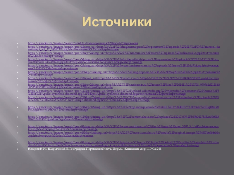 Назаров Н.Н., Шарыгин М.Д. География. Пермская область.-Пермь, «Книжный мир», 1999,с.248.