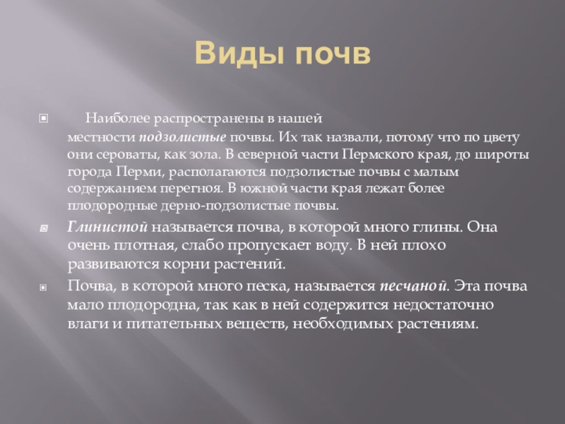 Наиболее распространены в нашей местности подзолистые почвы. Их так назвали, потому что