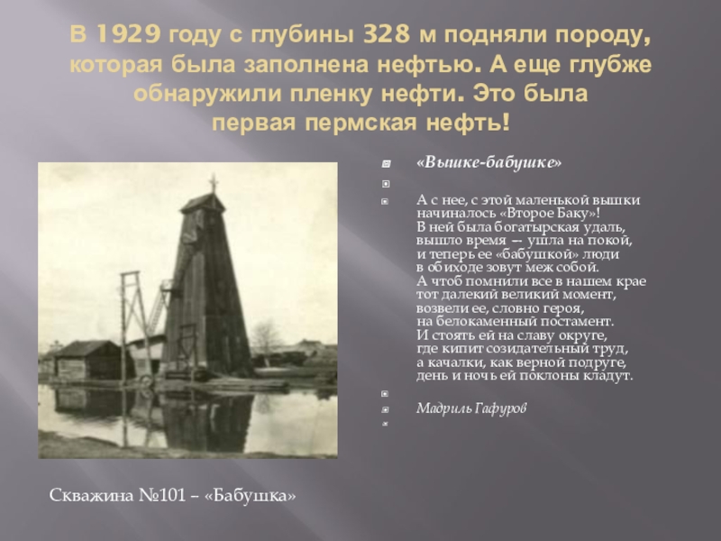 Слайд 7В 1929 году с глубины 328 м подняли породу, которая была заполнена нефтью. А