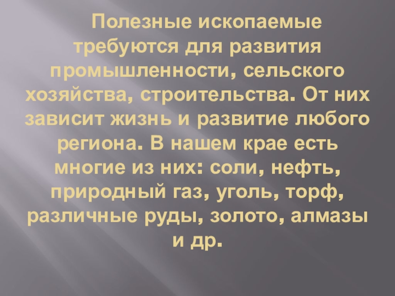 зависит жизнь и развитие любого региона. В нашем крае есть многие из них: соли, нефть, природный газ, уголь, торф, различные руды, золото, алмазы и др.