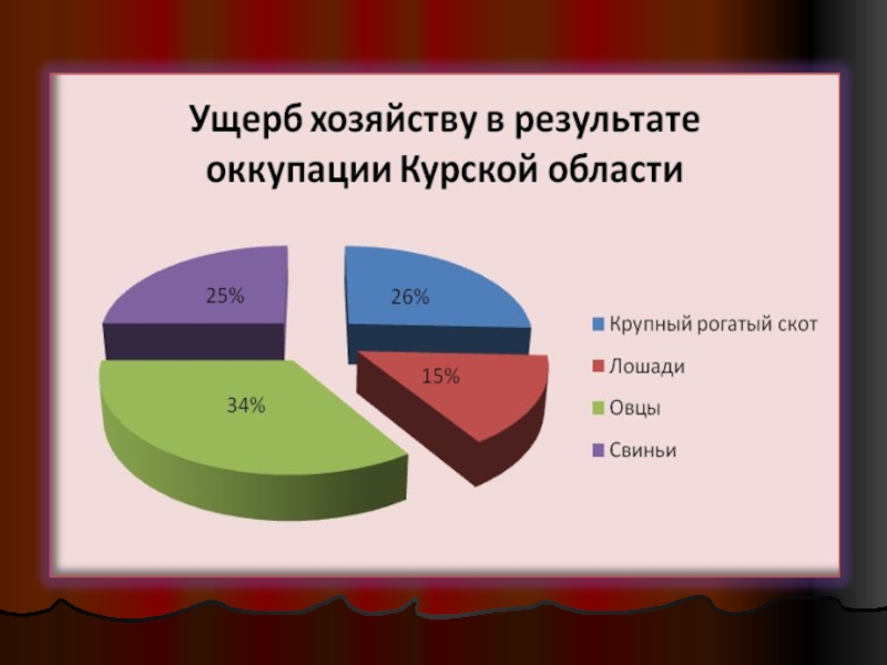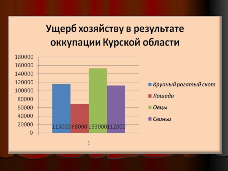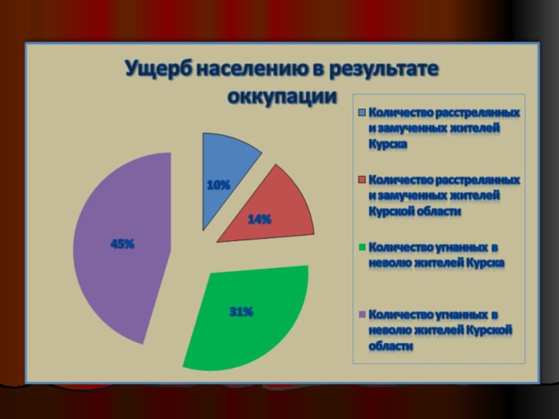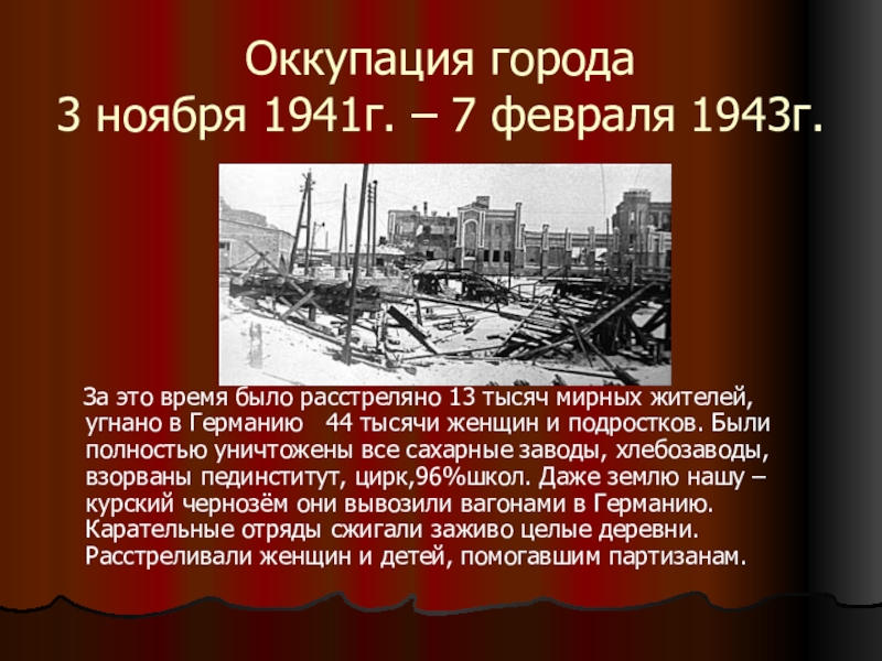 время было расстреляно 13 тысяч мирных жителей, угнано в Германию 44 тысячи женщин и подростков. Были полностью уничтожены все сахарные заводы, хлебозаводы, взорваны пединститут, цирк,96%школ. Даже землю нашу – курский чернозём они вывозили вагонами в Германию. Карательные отряды сжигали заживо целые деревни. Расстреливали женщин и детей, помогавшим партизанам.