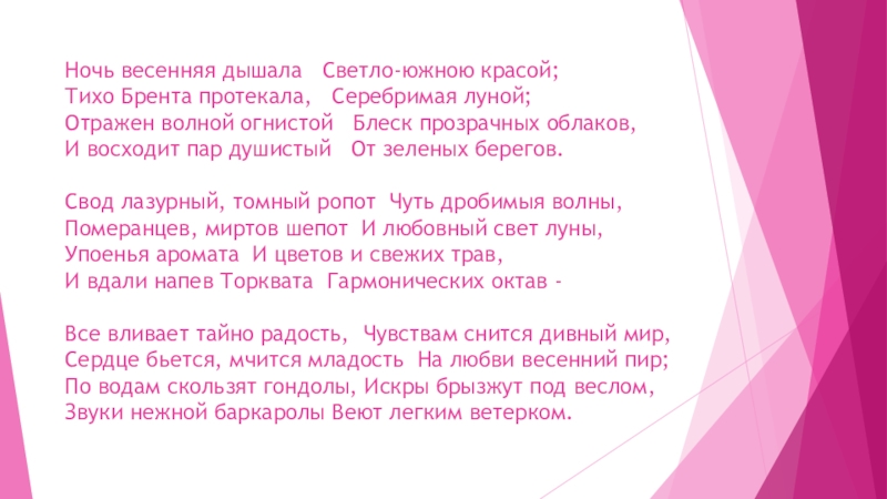 Слайд 10 Ночь весенняя дышала Светло-южною красой; Тихо Брента протекала, Серебримая луной; Отражен