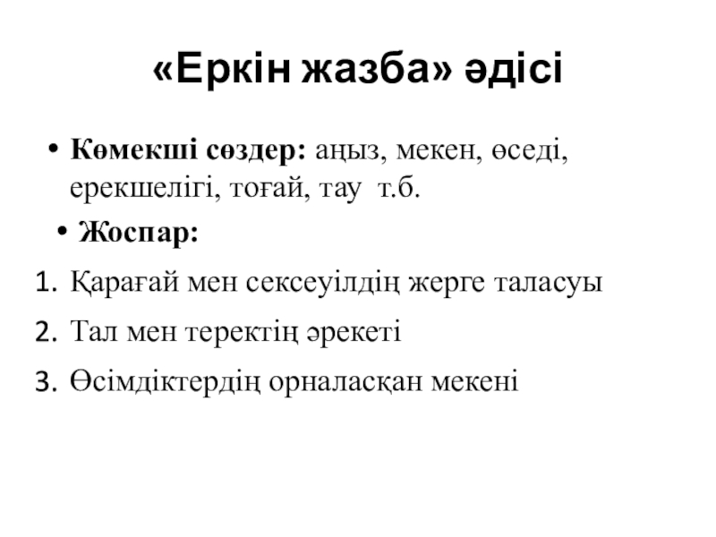 «Еркін жазба» әдісі Көмекші сөздер: аңыз, мекен, өседі, ерекшелігі, тоғай, тау т.б.Жоспар: Қарағай мен сексеуілдің жерге таласуыТал