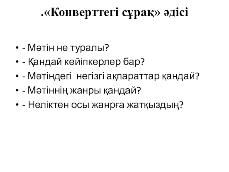 .«Конверттегі сұрақ» әдісі - Мәтін не туралы?- Қандай кейіпкерлер бар?- Мәтіндегі негізгі ақпараттар қандай?- Мәтіннің жанры қандай?-