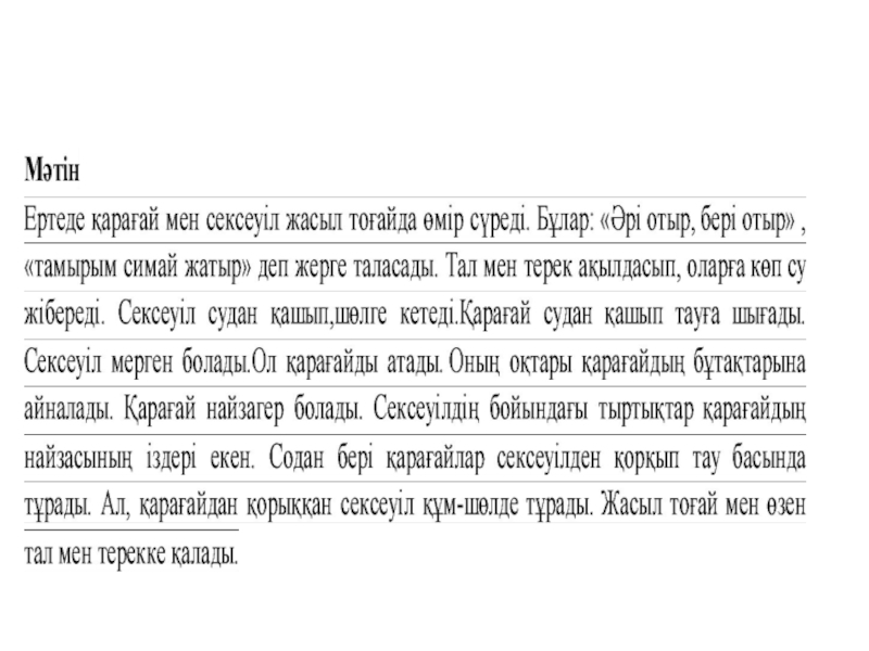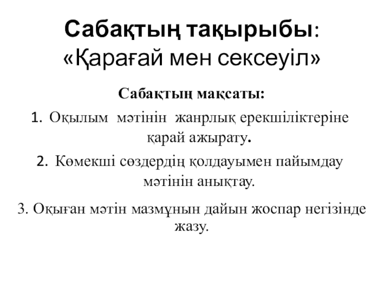 Сабақтың тақырыбы: «Қарағай мен сексеуіл»Сабақтың мақсаты:Оқылым мәтінін жанрлық ерекшіліктеріне қарай ажырату.Көмекші сөздердің қолдауымен пайымдау мәтінін анықтау.3. Оқыған