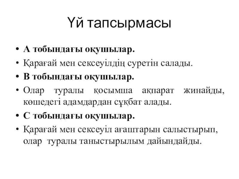 Үй тапсырмасыА тобындағы оқушылар.Қарағай мен сексеуілдің суретін салады.В тобындағы оқушылар.Олар туралы қосымша ақпарат жинайды, көшедегі адамдардан сұқбат
