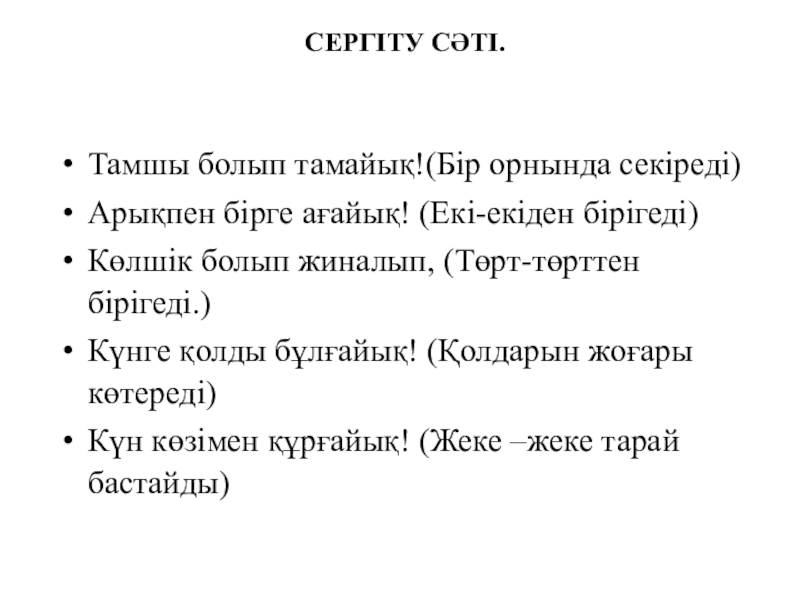 СЕРГІТУ СӘТІ. Тамшы болып тамайық!(Бір орнында секіреді)Арықпен бірге ағайық! (Екі-екіден бірігеді)Көлшік болып жиналып, (Төрт-төрттен бірігеді.)Күнге қолды бұлғайық! (Қолдарын