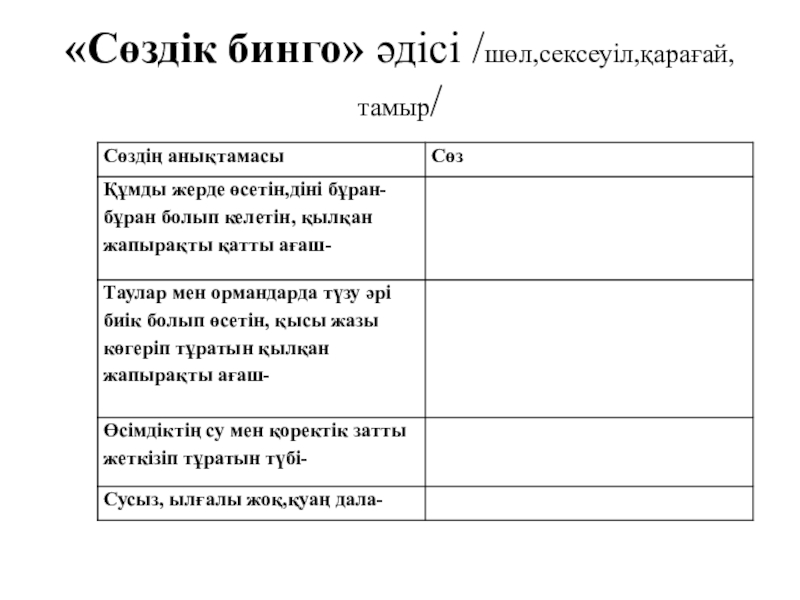 Слайд 7«Сөздік бинго» әдісі /шөл,сексеуіл,қарағай,тамыр/