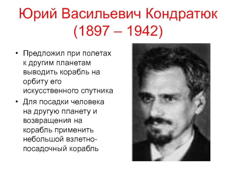 Юрий Васильевич Кондратюк (1897 – 1942)Предложил при полетах к другим планетам выводить корабль на орбиту его искусственного