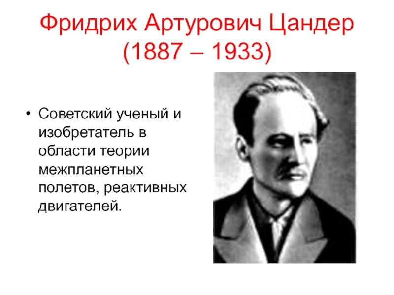 Фридрих Артурович Цандер (1887 – 1933)Советский ученый и изобретатель в области теории межпланетных полетов, реактивных двигателей.