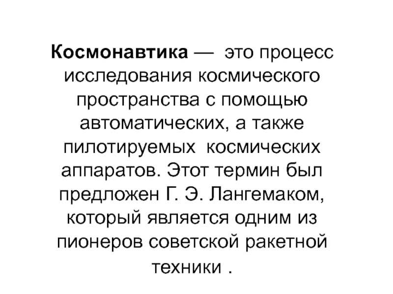 Космонавтика —  это процесс исследования космического пространства с помощью автоматических, а также   пилотируемых  космических аппаратов. Этот термин был предложен Г. Э. Лангемаком, который является одним из пионеров советской ракетной техники .