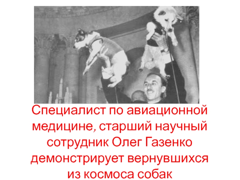 Специалист по авиационной медицине, старший научный сотрудник Олег Газенко демонстрирует вернувшихся  из космоса собак