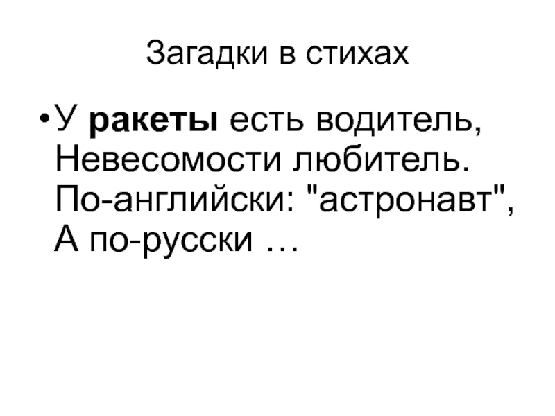Загадки в стихахУ ракеты есть водитель, Невесомости любитель. По-английски: