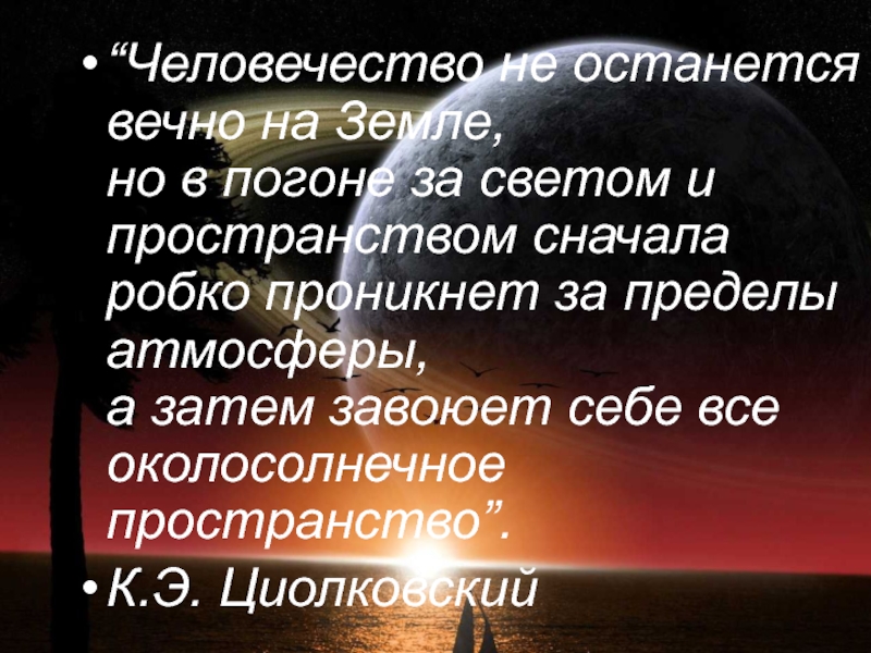 Слайд 39“Человечество не останется вечно на Земле, но в погоне за светом