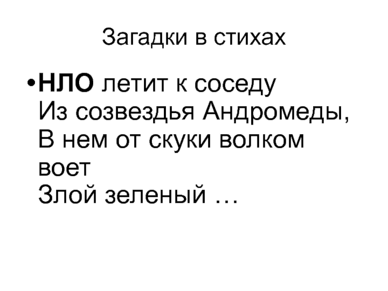 Загадки в стихахНЛО летит к соседу Из созвездья Андромеды, В нем от скуки волком воет Злой зеленый