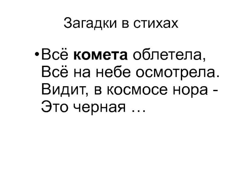 Загадки в стихахВсё комета облетела, Всё на небе осмотрела. Видит, в космосе нора - Это черная …
