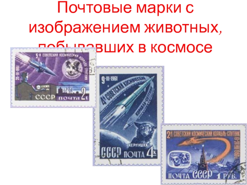 Слайд 21Почтовые марки с изображением животных, побывавших в космосе