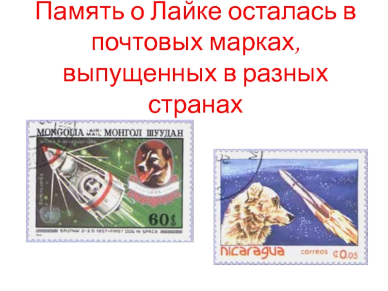 Слайд 17Память о Лайке осталась в почтовых марках, выпущенных в разных странах