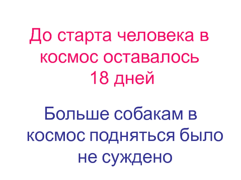 До старта человека в космос оставалось  18 днейБольше собакам в космос подняться было не суждено