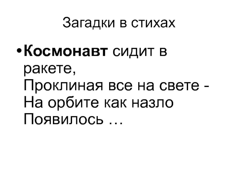 Загадки в стихахКосмонавт сидит в ракете, Проклиная все на свете - На орбите как назло Появилось …
