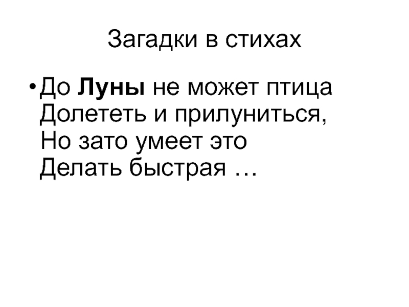 Загадки в стихахДо Луны не может птица Долететь и прилуниться, Но зато умеет это Делать быстрая …