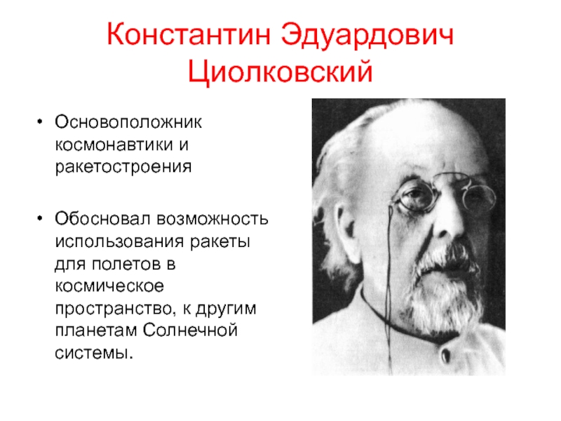 Константин Эдуардович ЦиолковскийОсновоположник космонавтики и ракетостроенияОбосновал возможность использования ракеты для полетов в космическое пространство, к другим планетам