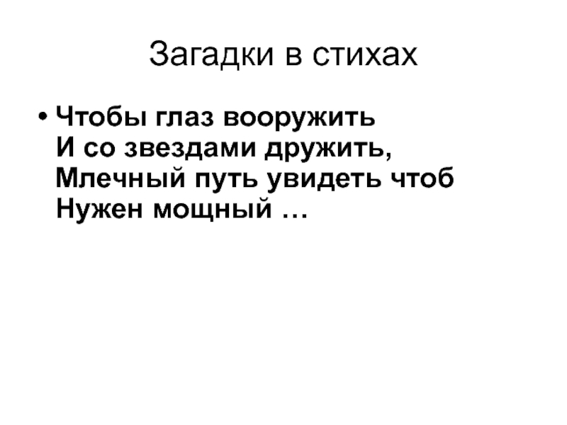 Загадки в стихахЧтобы глаз вооружить И со звездами дружить, Млечный путь увидеть чтоб Нужен мощный …