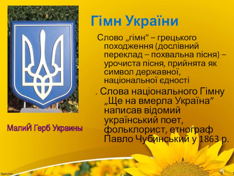 . Слова національного Гімну „Ще на вмерла Україна” написав відомий український поет, фольклорист, етнограф Павло Чубинський у 1863 р.