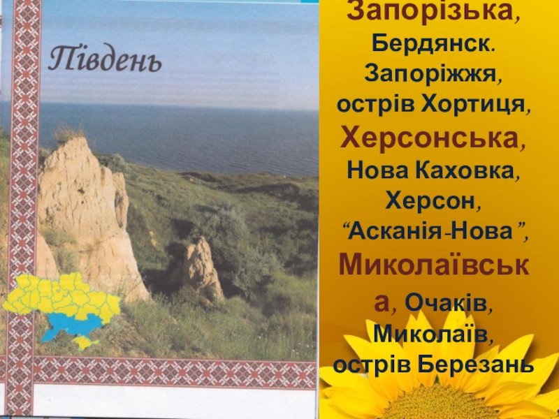 Слайд 20Запорізька, Бердянск. Запоріжжя, острів Хортиця, Херсонська,
