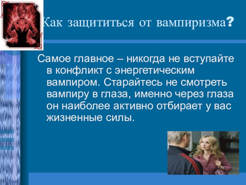 с энергетическим вампиром. Старайтесь не смотреть вампиру в глаза, именно через глаза он наиболее активно отбирает у вас жизненные силы.