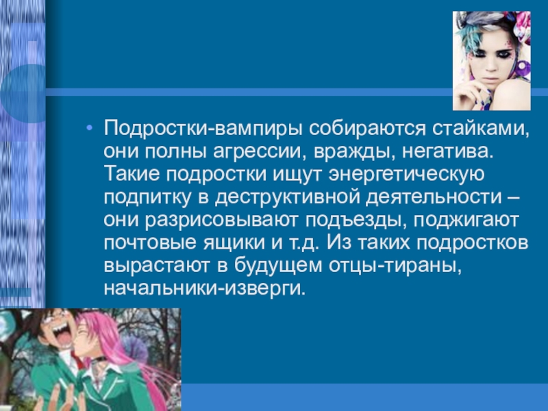 Подростки-вампиры собираются стайками, они полны агрессии, вражды, негатива. Такие подростки ищут