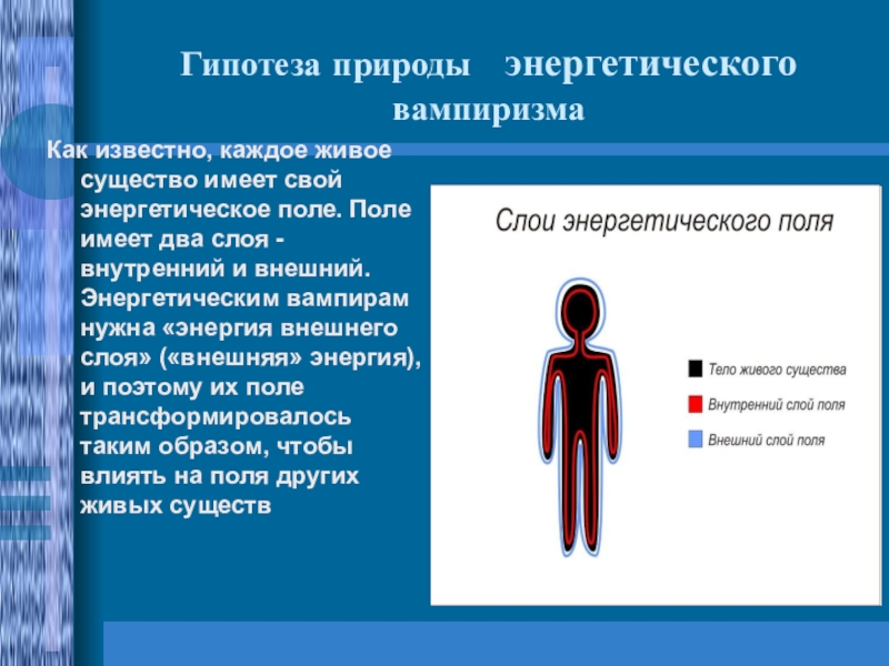 поле. Поле имеет два слоя - внутренний и внешний. Энергетическим вампирам нужна «энергия внешнего слоя» («внешняя» энергия), и поэтому их поле трансформировалось таким образом, чтобы влиять на поля других живых существ