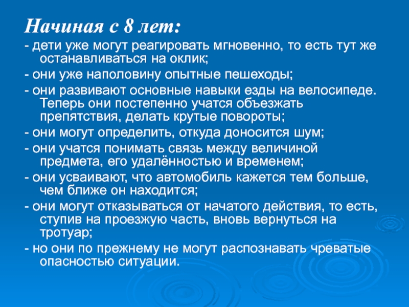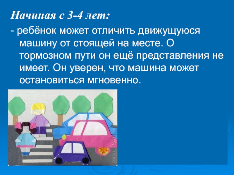 стоящей на месте. О тормозном пути он ещё представления не имеет. Он уверен, что машина может остановиться мгновенно.
