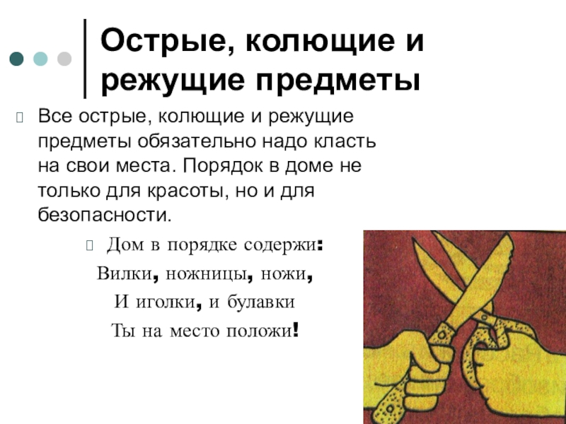 Острые, колющие и режущие предметыВсе острые, колющие и режущие предметы обязательно надо класть на свои места. Порядок в доме не только для красоты, но и для безопасности.Дом в порядке содержи:Вилки, ножницы, ножи,И иголки, и булавкиТы на