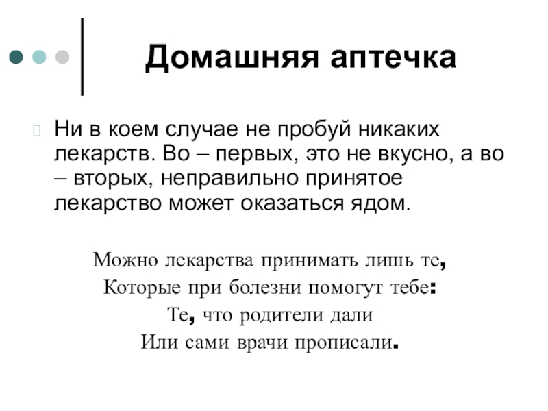 Домашняя аптечка Ни в коем случае не пробуй никаких лекарств. Во – первых, это не вкусно,