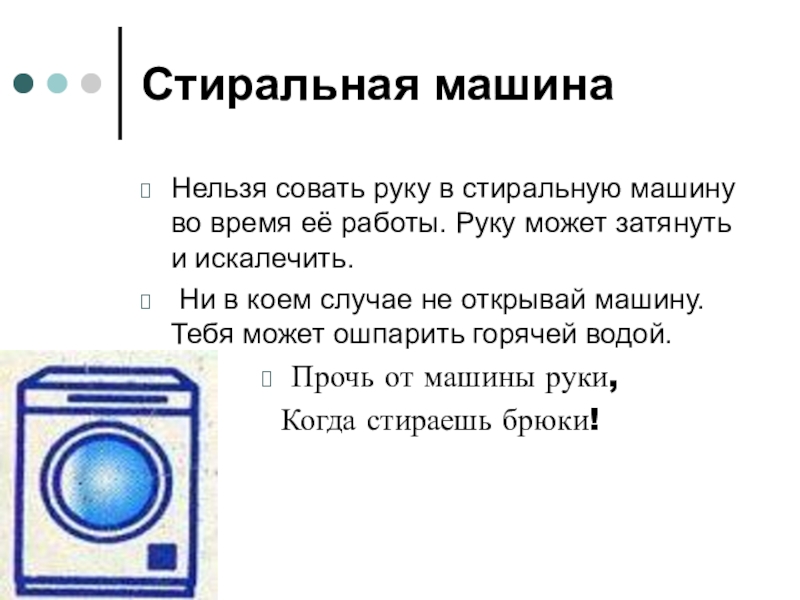 Стиральная машинаНельзя совать руку в стиральную машину во время её работы. Руку может затянуть и искалечить. Ни