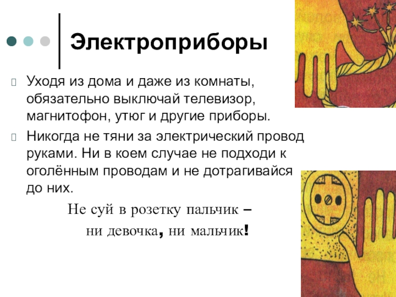 ЭлектроприборыУходя из дома и даже из комнаты, обязательно выключай телевизор, магнитофон, утюг и другие приборы.Никогда не тяни